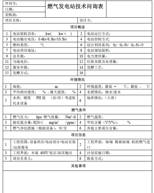 燃氣發(fā)電站技術問詢表